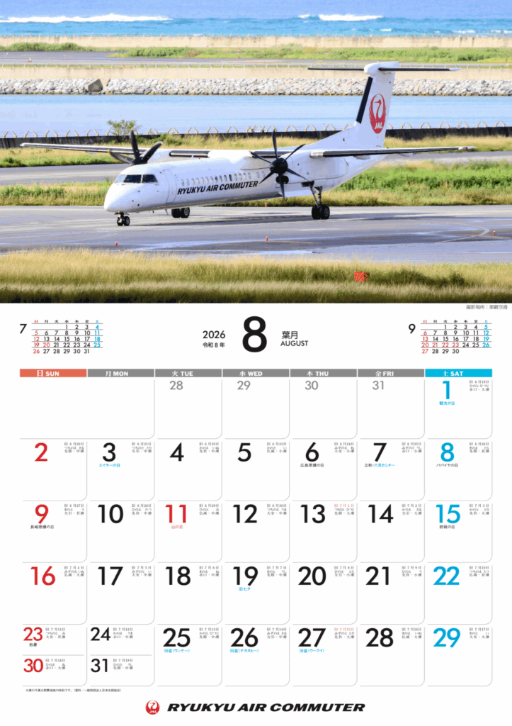 RACスタッフが撮影した就航地の風景とともにDHC-8-400カーゴコンビの魅力を一年を通してお楽しみいただけます。日付部分に旧暦や沖縄の旧暦行事も記載♪