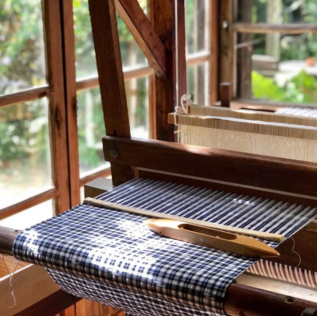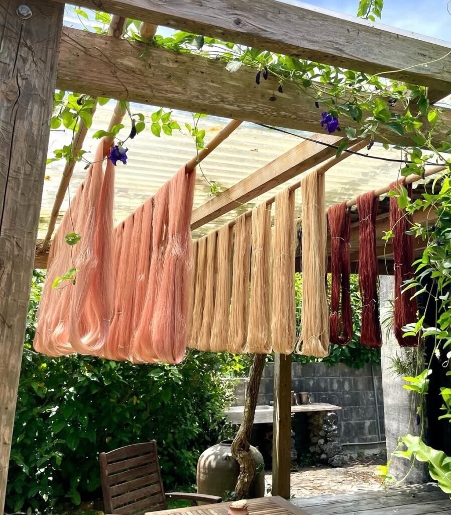 与那国花織は、花模様が美しい伝統織物で、島の植物で草木染めした絹糸で手織りしています。